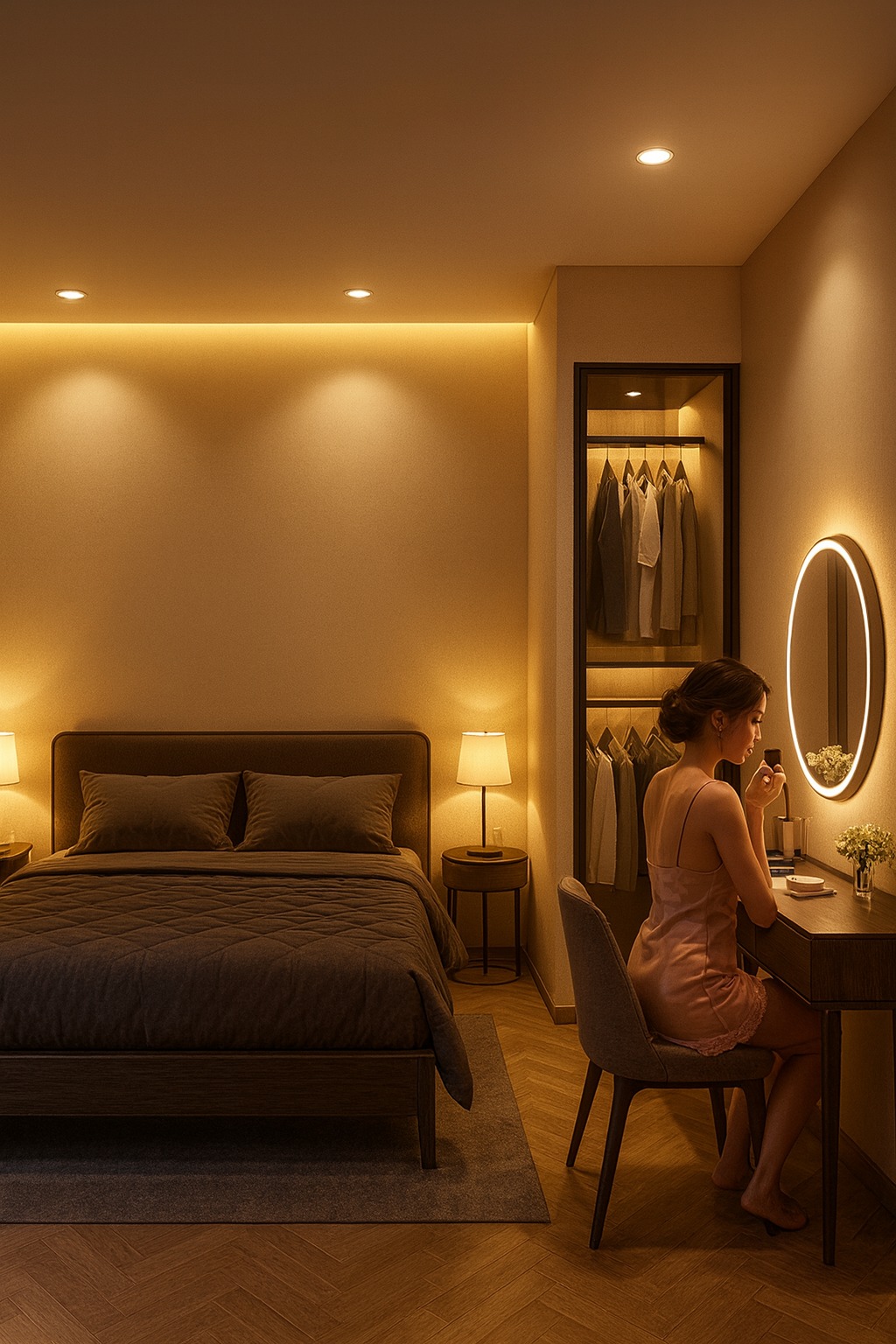 Bên cạnh đó, giải pháp lắp đặt đèn cảm biến (sensor) tại tủ quần áo hoặc lối đi là một bước tiến của sự tinh tế. Ánh sáng sẽ tự động kích hoạt với cường độ thấp khi bạn di chuyển vào ban đêm, giúp đảm bảo an toàn mà không làm "tỉnh giấc" các tế bào thần kinh của bạn.